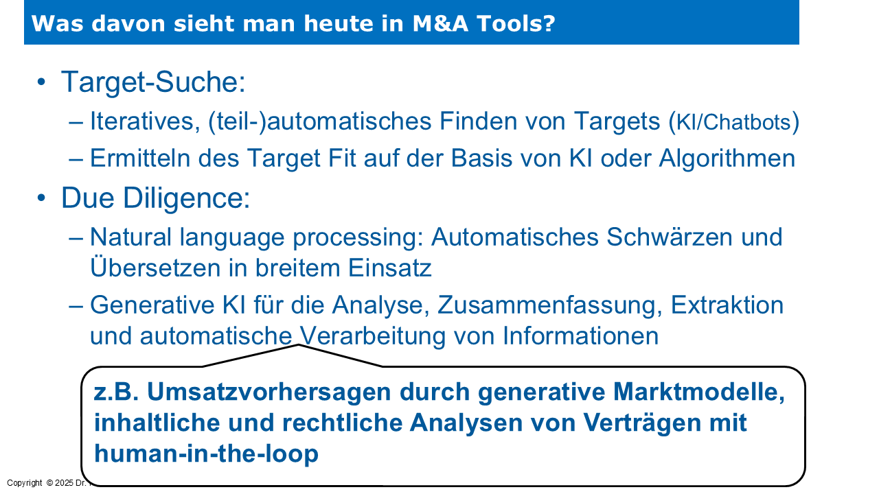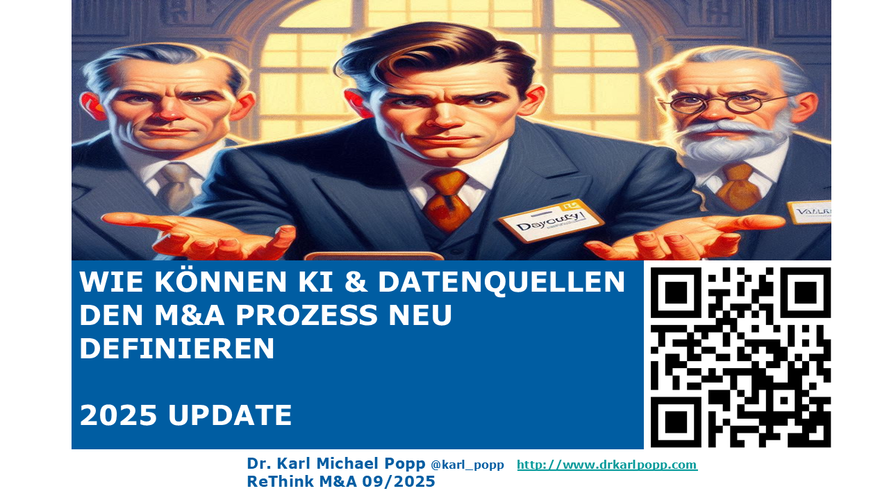 Der Vortrag von Dr. Karl Michael Popp befasst sich mit der Frage, wie KI-gestützte Datenquellen den M&A-Prozess (Mergers & Acquisitions) im Jahr 2025 neu definieren können und bietet ein aktuelles Update zu technologischen Entwicklungen in diesem Bereich.