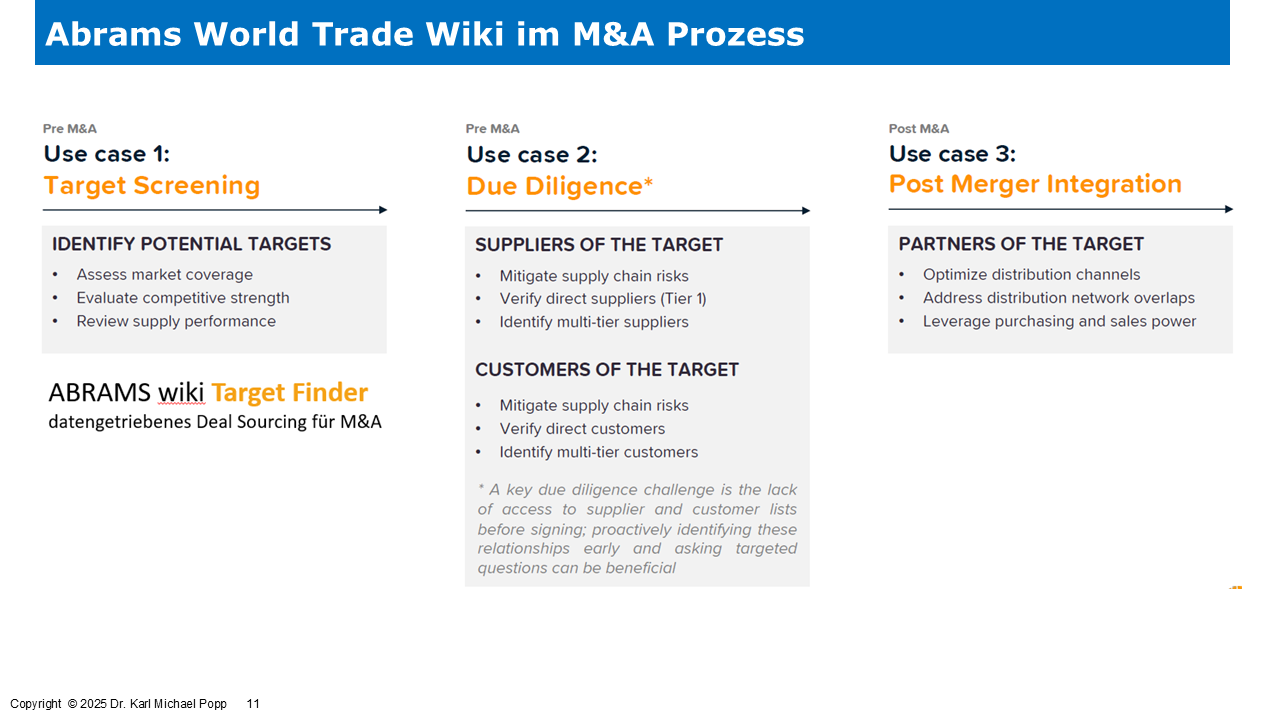 Innovative Tools wie PATEV und Abrams World Trade Wiki werden als Lösungen vorgestellt, die sofortigen Zugriff auf globales Know-how, Transparenz von Handelsdaten sowie fundierte Entscheidungsunterstützung bei Target Search, Due Diligence und Integration bieten.